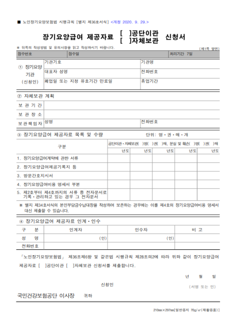 신청서, 이관목록표, 분실 및 훼손 목록표, 5년치 급여제공 자료 등